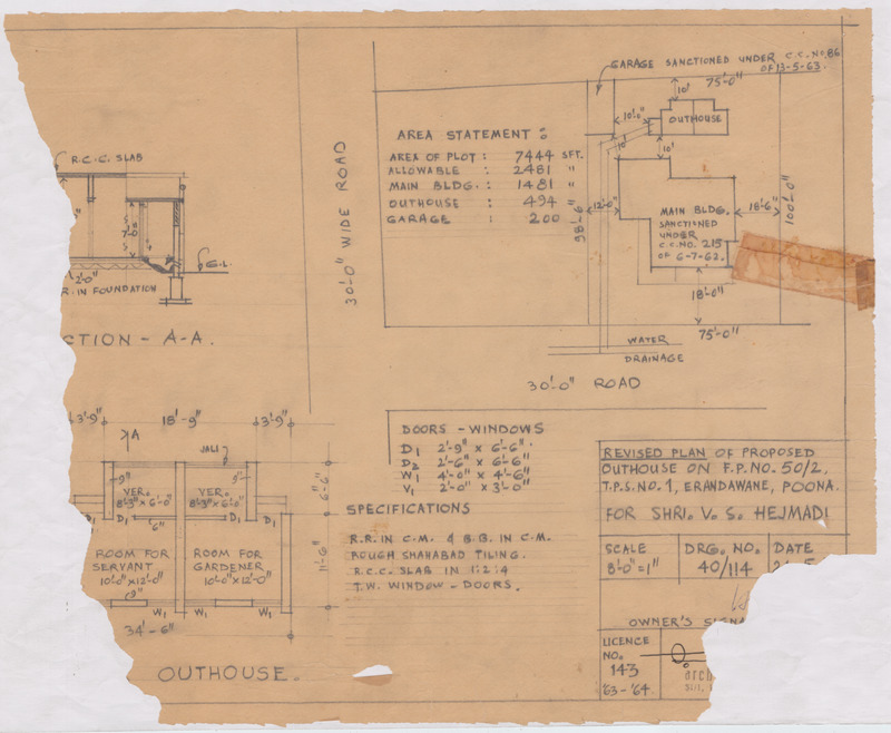 floor plans (orthographic projections) elevations (orthographic projections) sections (orthographic projections) Greyscale ; Scale - 8'-0" = 1" Shri. V.S Hejmadi (Client); Abhay B. Sharma and Vijay V. Ghotge (Architects) This is an incomplete drawing due to being torn from the edges. |