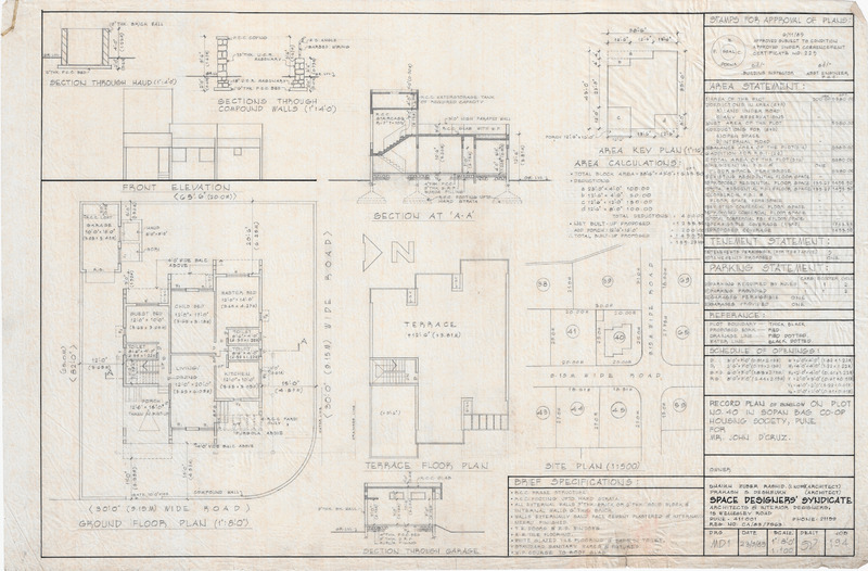 2 floor plans (orthographic projections) elevations (orthographic projections) 4 sections (orthographic projections) key plans site plans Scale - 1":8'.0", 1:100 Stakeholders - Mr. John D'Cruz (Client), Space Designer's Syndicate (architects) |