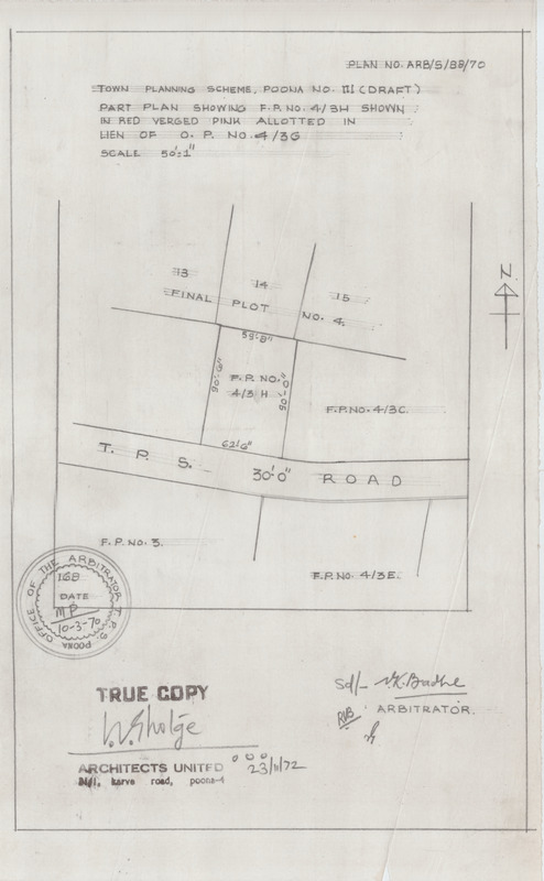 Town planning scheme, Poona no. III (draft) part plan showing F.P. no. 4/3H shown in red verged pink allotted in lien(line) of O.P. no.4/3G